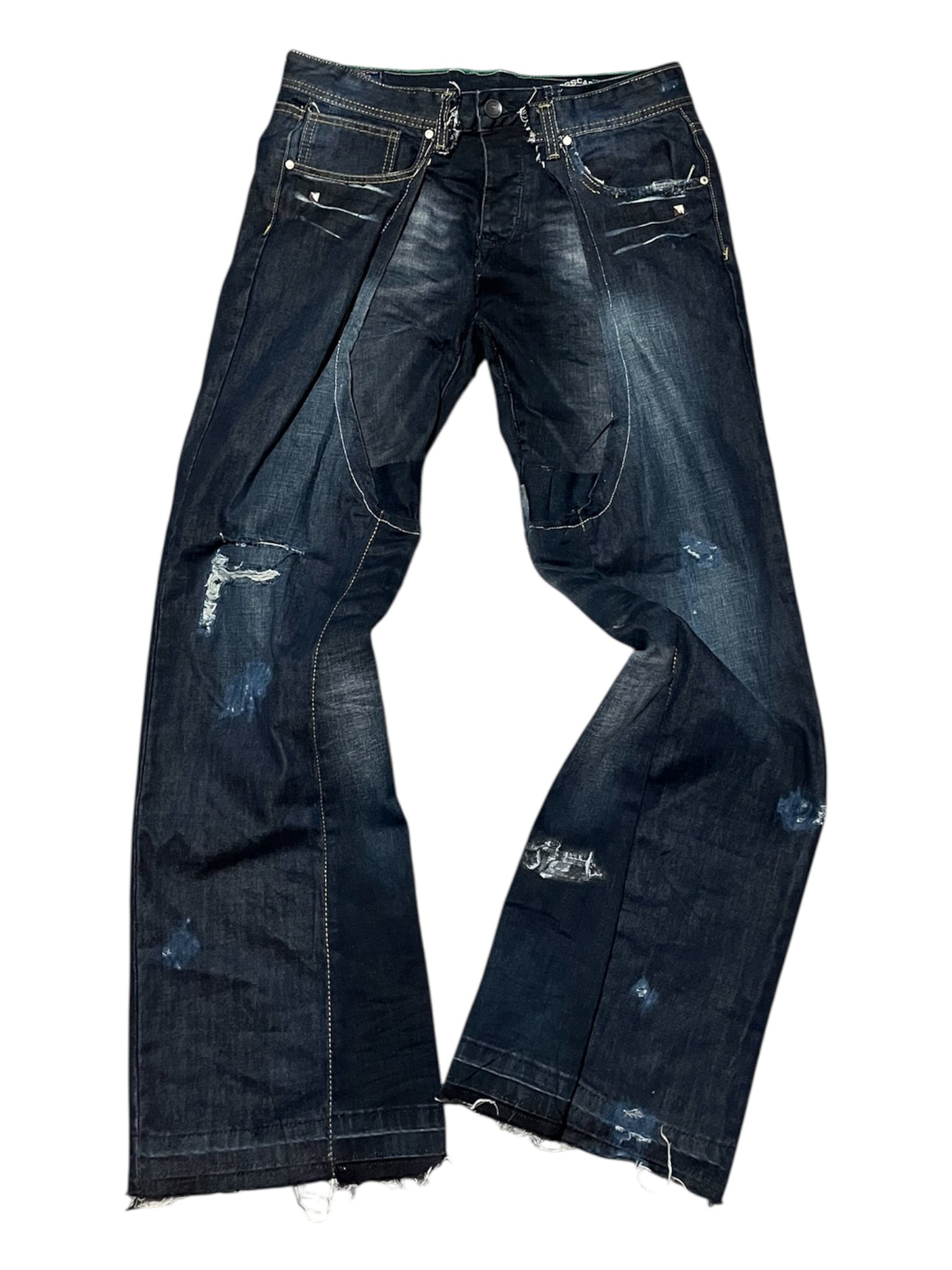 Yes it's what it looks like. 1 OF 1 XO SKELETON JEANS hand-made in the middle by the man himself, Marcus Rupac and orchestrated by Kion Folkes. Two jeans combined into one making a snug fitted denim piece.